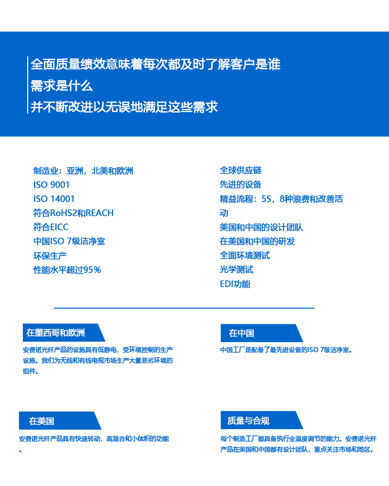 安費諾總部位於(yú)美國康涅狄格州,集團在全球實施本地化戰略,共在全球設立90多間工廠及100多個銷售辦(bàn)事處,全球員工總數達30000人,直接爲各大洲的客戶提供産品和實施本地化服務在世界上安費諾是其中一個最大的制造商的互連産品。公司設計、制造和市場電氣、電子和光纖連接器,同軸和扁平帶狀電纜和互連系統